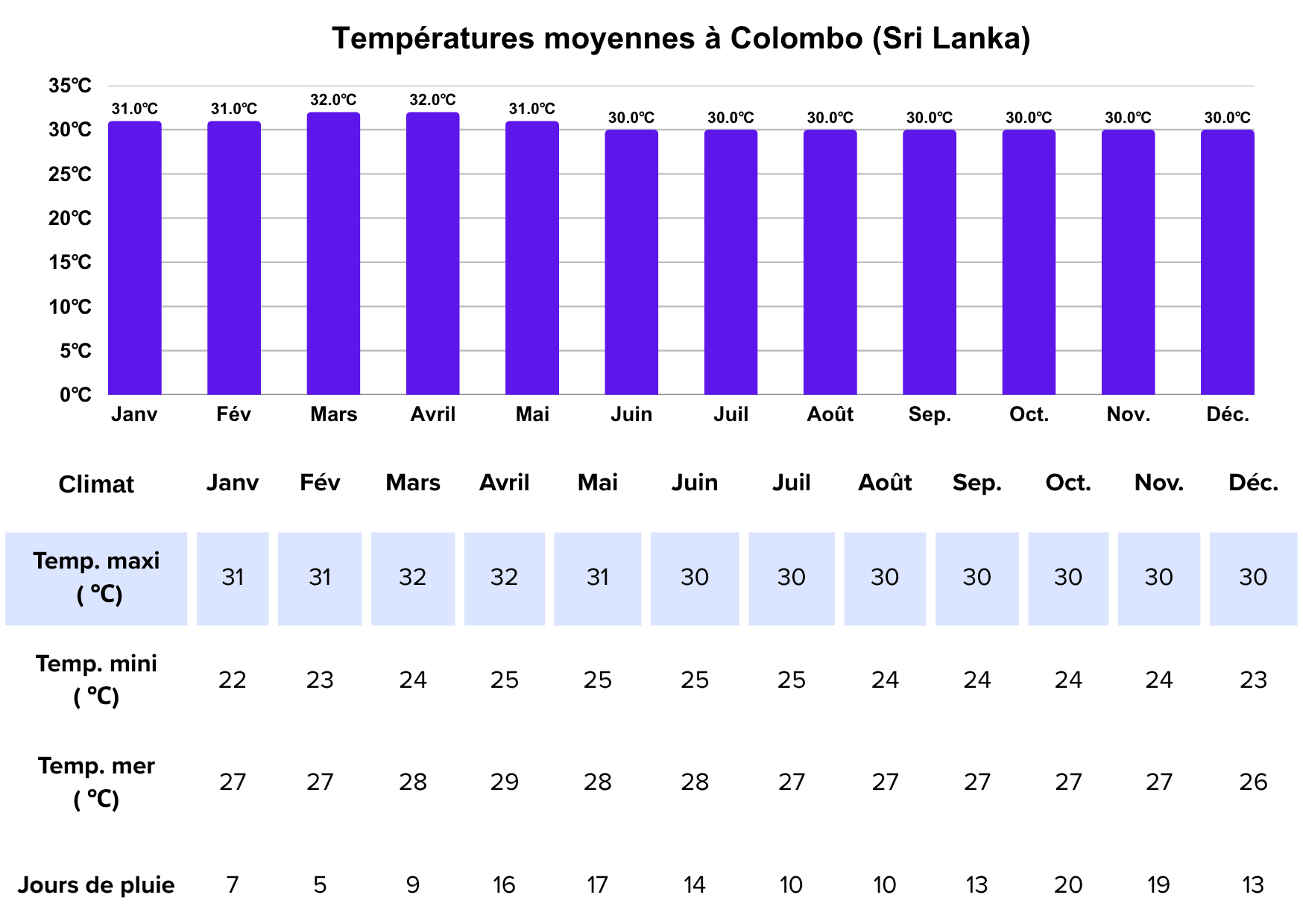 Le Sri Lanka a un climat tropical chaud toute l’année, avec des températures entre 25 et 32 °C.