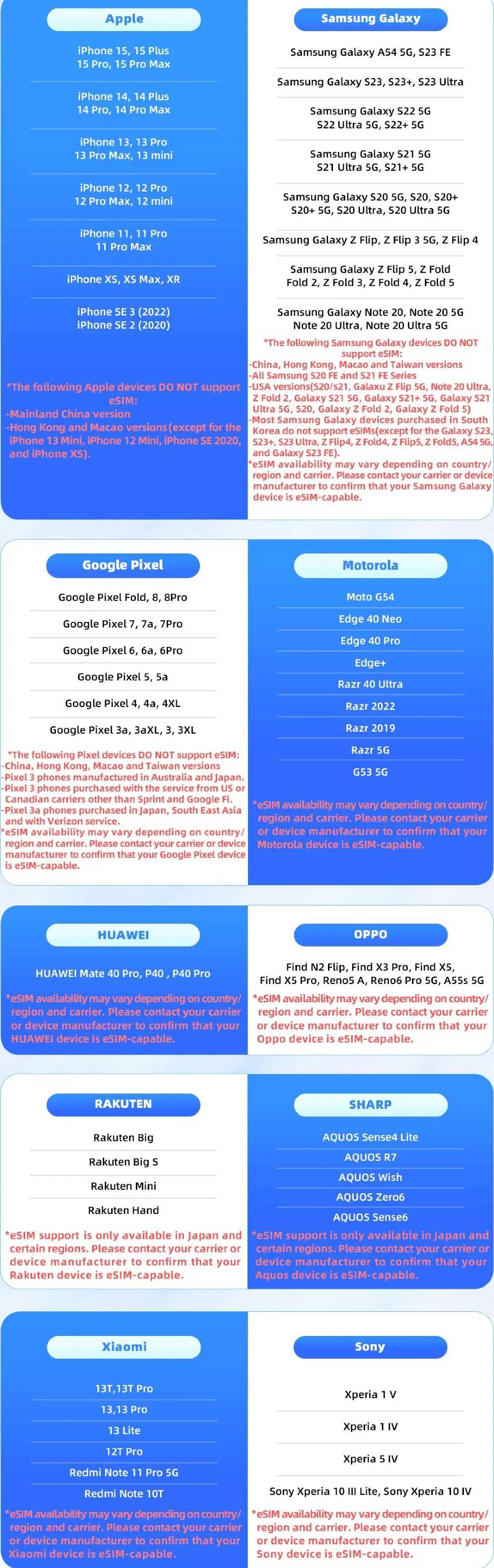 Pour utiliser une eSIM, votre appareil doit être déverrouillé par l'opérateur et compatible eSIM. Veuillez vous assurer que votre téléphone est compatible eSIM avant l'achat. Aucun remboursement ne sera accordé en cas d'annulation pour incompatibilité. * Pour vérifier si votre téléphone prend en charge l'eSIM, veuillez composer le *#06#. Si l'EID s'affiche, cela indique généralement la compatibilité eSIM. (Selon le système d'exploitation et le fabricant, même si l'EID répond aux exigences, il peut ne pas fonctionner en raison des spécifications de l'appareil.)