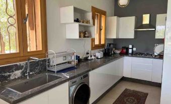 La terrasse de la villa offre une vue imprenable sur les majestueuses montagnes de l'Atlas, créant un cadre serein pour votre séjour. Le jardin entourant la villa est magnifiquement aménagé, offrant une oasis de paix propice à la détente. L'emplacement de la propriété à proximité du désert d'Agafay ajoute à son charme, offrant une opportunité unique d'explorer le magnifique paysage désertique. À seulement cinq minutes en voiture du lac Lalla Takerkousst, vous pourrez profiter de la beauté et des activités récréatives que le lac a à offrir.
