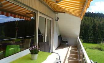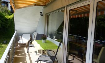 The large covered balcony with a fantastic view of the surrounding forests and meadows invites you to linger. The apartment has a large bright living and dining room, the fitted kitchen is equipped with a fridge and freezer, stove with oven, coffee machine, toaster, kettle, microwave and all necessary cookware and dishes.