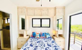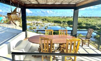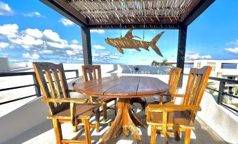 PERFECT beach villa for adult get-away! (no children under 12). Modern bright & airy w/ 360 VIEWS, rooftop dining, & semi private beach with Palapa & hammocks just across the street. (West side beach so NO sargassum here) Fast & reliable wifi 20mbps. Located 4.5 miles south, this villa has 2 separate living areas exclusively for your use: upstairs and downstairs; both w/ gorgeous bay views, own bath & private decks. Upstairs has fully equipped kitchen & living room. Downstairs has sitting area with minifridge, coffeemaker, plus an outdoor shower. Bonus access to resort facilities & pool right next door @ Playa de Sala (infinity pool, beachfront Boat Bar and full service Restaurant) pool use with any food/drink purchases. This home is not suitable for those with mobility issues, difficulty with stairs or young children (for safety).