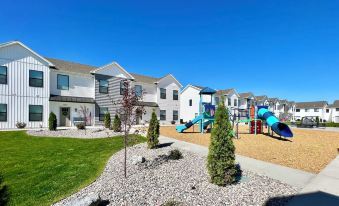 New & nicely furnished townhome located close to everything! Mall, Shopping, Dining, entertainment and a short walk over to Wall Mart! An attached 2 car garage. Bright and open great room. A huge master bedrm with a king size bed has an en-suite bath. An office/bedroom with a single pull out sofa. A rm with a queen bed and the 4th rm with 2 twins & one with a trundle making it 3 twins. A fenced in dog park a few houses down and there will be a park right out the front door!