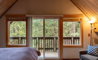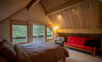 - Spacious upstairs bedroom with queen bed, sofa bed, vaulted ceiling, private outdoor deck, and mini-split AC/Heat