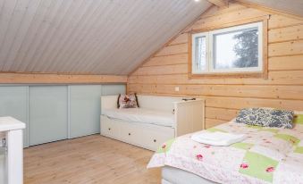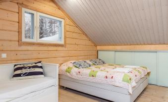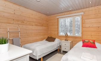 Log panel villa, built in 2012. A kitchen, living room with fireplace, 2 bedrooms, one with double bed and TV, another with 2 beds. Loft with 2 beds and 2 extra beds (sofa bed). A sauna with electric stove, bathroom with 2 showers, dressing room/utility room. Covered rear terrace.