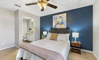 Each bedroom is equipped with a queen bed with memory foam mattress, four pillows, small dresser, two end tables that can be pulled in close to the bed to act as a small table or desk, and a smart TV.