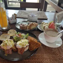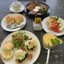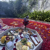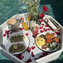 We received a refreshing welcome drink which is good. The room service foods are delicious and in Kavana Bar. We availed the floating breakfast and the pool decor for my birthday and it was amazing. The staffs even surprised me with a birthday cake and a song. I am very pleased and the memories are precious staying in this villa. It is also serene and can help relax the tired mind and body in the pool. The bath tub is with bath foam nearby too for a bubble bath.