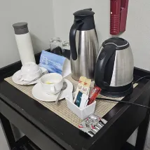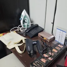 J'ai réservé une chambre pour deux personnes. Elle est équipée d'un réfrigérateur, de la climatisation, d'une bouilloire, de tasses, d'eau, d'une douche chaude, d'un bidet, d'un bol de soupe, de deux tables et d'une chaise. Pas d'ascenseur, ni de mouchoirs en papier.