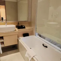 Malgré les autres problèmes, ma chambre était plutôt confortable. La baignoire semblait relativement récente et la douche était bien équipée : douche à effet pluie, douchette latérale et pommeau de douche à main, le tout avec des zones d'eau et de séchage séparées.