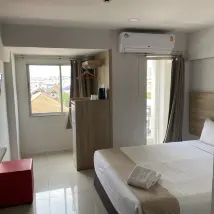 Chambre propre, climatisation fraîche, bon personnel de service, parking pratique.