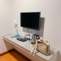 Отель на пару ночей, не больше. Номер большой, но требует ремонта. Кровать большая, удобная. В ванной комнате душ течёт, кран тоже. Дверь входная расшатана. Стучит когда включён кондиционер, а он всегда включён.