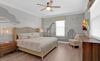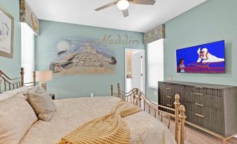 The five bedrooms in this home are spacious and themed to perfection; The Peter Pan, Aladdin, and Lion King rooms are all king bedrooms. There is also a Mickey and Minnnie room with full-size double over double bunk beds (4 double beds total), and the Harry Potter room with 2 twin size beds.