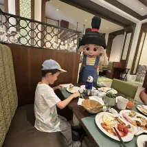 Le buffet du petit-déjeuner est très sympa : il y a les Minions, Gru, Agnès et Edith… etc. On peut prendre des photos avec eux et ils passent aussi. Personnel très sympathique.