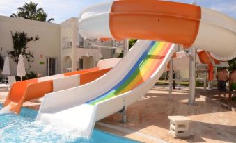 Nous sommes dans cette hôtel actuellement tout d’abord se n’est pas du tout un 5 étoiles mais plutôt un 3 étoile niveau standing et prestations. Alors les chambres sont propre et le mobilier est assez moderne et correct par contre les parties communes sont très abimé porte grater, carrelage fissuré. Pour avoir un transat au bord de la piscine c’est mission impossible pareil pour une table pour dîner si on arrive pas à l’ouverture c’est fini on reste debout pendant 30 min pour attendre que quelqu’un parte. Le petit déjeuner est très minimaliste rien pour les becs sucrée vraiment que du salé et les omelettes préparées à la minute ne donne pas spécialement envie. Par contre le repas du midi et du soir sont très varié et très bon! Le personnel est très très gentils sans exception réception, femme de ménage, serveurs….la situation de l’hôtel est bien placé avec la possibilité de s’y rendre à pieds avec une promenade agréable. Les 2 toboggans sont très sympa et amusant pour les enfants. Le tout inclus est basic ( pas de cocktail, pas de glaces…. ) par contre snack de 14 à 16h (burger, nuggets, frites) et tea time avec biscuits de 16 à 17h.