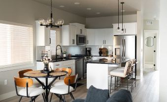 Upstairs, two spacious bedrooms each feature private en-suite bathrooms. Downstairs a third bedroom is paired with a full bath-ideal for guests who prefer to avoid stairs. The open living area is perfect for relaxing after a day of Boise adventures, and the fully equipped kitchen makes it easy to enjoy meals at home. Start your day with a coffee on the inviting front porch, and end it by cozying up in the living room with your favorite show or book.