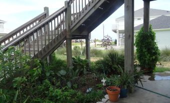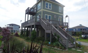 Beautifully landscaped fully furnished home, with 4 bedrooms, 2 indoor bathrooms, 2 living areas, 4 balconies, and a cargo lift. We are located in the middle of Bolivar Peninsula, beach side, in an area referred to as “shark’s tooth alley”. We are not in the busiest/craziest part of the beach but more in the family oriented part.