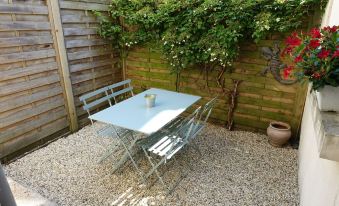 The living room, dining room and kitchen are on the ground floor. The dining room opens onto a small courtyard with garden furniture.