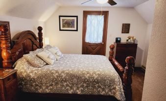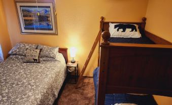 The ground floor level hosts a beautiful galley kitchen with granite counter tops, stainless steel applicances and heated tile floor with an open floor plan to the dining room and living room. Our kitchen will allow you to prepare any meal of choice as we have it fully stocked with all the utensils you may need! If you'd rather not cook, our table and bar provide perfect seats for your meal you bring in. Cozy up by the fire in the living room and enjoy a football game in the winter. The open floor plan is also ideal for multiples games which are also already at the cabin for your convenience. The bedroom on the main floor has a Queen bed as well as a Twin over Twin bunk bed with plenty of space. The closet in the bedroom houses the items you may need for your little traveler to make memories with new blocks, toys, sleds and books. The bathroom on the main floor has a double basin, large shower, and NEW heated tile floors to keep your toes warm! Upstairs you will find 1 more bedroom and another bathroom. The upstairs Master WALKS OUT onto a deck overlooking the yard! The closet in this room provides a pac n play, highchair, stroller etc. You will find ample space to sleep your young travelers with memories and bedtime stories galore! Or take a break as a couple as enjoy quiet moments together. The bathroom is smaller but very functional for upstairs guests. We have updated all bedding to keep a rustic but modern feel for our guests!