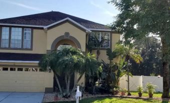 NO PARTIES OR LOUD NOISE ALLOWED! Perfect for travelers focused on fun, family, and faith. With 5 bedrooms and many sleeping options, bring the relatives! Located on a lake- bring the boat! Extensive entertaining/living space, pool + spa, + a dock on a canal. Connect with nature. Home features Christian art- if such offends you, this is not for you. Pool + spa heat is $75/day; spa only for $35/day. Near to parks, shopping, airport, stadiums, colleges, theme parks. Beaches are ~40 mi, + Disney ~50 mi.