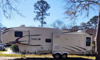 We have our RV for rent here at our home completely set up for you to enjoy. The only thing you should have to do is sit back and enjoy your stay. If your passing though the Savannah area and looking to spend some time here we have it set up in our serene backyard which has a fire pit, picnic table & grill for enjoyment. Our RV sleeps four people comfortably with lots of amenities for your comfort. The living area is quite spacious, there are two recliners and a couch that makes out into a double bed. There is a ceiling fan and electric fireplace if needed. The kitchen has a nice Island and cookware underneath, and a convection microwave and is well stocked for most all your needs w/plenty of counter space also. When you get ready to eat you can sit at the dining table which has 4 chairs for everyone. The outside of the camper has a nice awning and recently added outside lights in the back around the firepit patio area. The RV is self-contained with all utilities running off gas and electricity such as the gas stove and gas hot water heater. The RV also has two AC units to keep you cool, one in the living area which is vented throughout the whole RV and another AC unit in the bedroom for added cooling. There are also 2 TVs for your enjoyment, one in living room and another in the bedroom, and we have high speed internet for your convenience. If you prefer to listen to music there is a newly installed radio also in the living area which has all the features you should need. We strive to make your stay with us as comfortable and enjoyable as if you were part of our family!About pets:Pets allowed: dogs and cats less than 20 lbs per pet (limit one pet total).There is a $75 pet fee charged for the booking.About checkOut:Check out before 11:00 AM.About children:Children allowed: ages 0-17.About customRules:Smoking allowed outside on the firepit patio (please dispose of cigarette butts in the fire ring).Your pet must be on a leash when outside and their waste picked up and disposed of in the outside trash can (bags available in RV and upon request),The 20 pounds or under pet weight limit strictly enforced, if not adhered to a $100 additional fee will be charged.About checkIn:Check in after 4:00 PM.About smoking:Smoking allowed: in designated areas.About minBookingAge:Minimum age to rent: 21.About events:No events allowed.