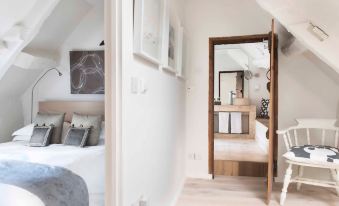 Upstairs the cottage has been furnished for relaxation, with the use of soft pale colours and crisp white linen. There is a master bedroom and another smaller bedroom and bathroom via a stone stairway from the main lounge. It contains a cd player and TV. The two further bedrooms have beautiful views over the garden and the village and share a luxury bathroom with a deep bath and underfloor heating for that added luxury.