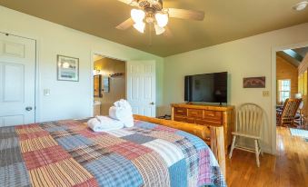 -Main Level Primary: King size log bed with ensuite. Mountain view. Large flat screen TV