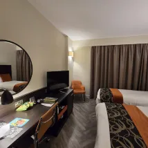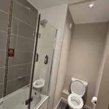 Booked room with walk in shower and large bed. First room had interconnecting door shower over bath and double bed. Second offer of a room was a disabled room still with just double bed. Then found out that all rooms only have double bed with shower over bath. Staff were very helpful but didn’t tell us upfront so we wasted a lot of time. In fact we didn’t have enough time to eat before we had to leave for our event. So finally we had to have a snack at 11:30 when we returned. Even then we had to go out to get it as room service is only available via an app