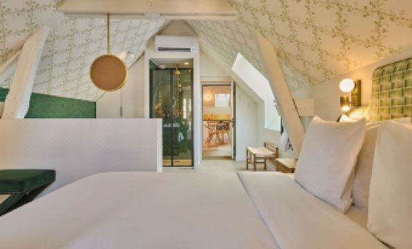 English is not spoken very well. Staff is unfriendly and cool, except one of the managers who could answer our questions about the town (I speak French, thankfully). Splurged on a lunch at the restaurant; food was fine and waitress was friendly but we ended up spending twice as much as we’d thought bc we didn’t understand that the prix fixe lunch menu consisted of just the daily special - no choices. Not adequately explained. No other food options on site but there’s an outdoor patio bar (too cold in October that week). But coffee and boulangeries, restaurants abound within a few blocks.
