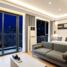 La décoration est un peu vieillotte, mais la chambre, quant à elle, est propre et rangée. Elle dispose d'un mini-réfrigérateur, d'une télévision, de la climatisation et d'un lave-linge. Situé dans un quartier d'immeubles de bureaux, l'endroit est assez calme, ce qui est idéal pour les voyages d'affaires.