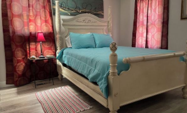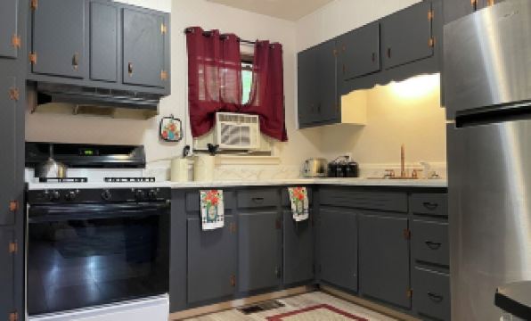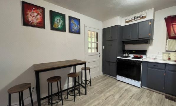 This newly remodeled gem has you enjoying two bed rooms (one with a queen bed, the other with two twin beds), one full bath, a welcoming living room, wifi, and a full kitchen. Parking is along the street with stairs leading up to the house at the top of the yard.