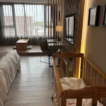 Avantages : Le lit est grand et une petite table près de la baie vitrée permet de profiter du paysage, de manger et de discuter. Dans l'ensemble, l'expérience est bonne. Le personnel de la piscine le soir du 14 juin est très sympathique. Il interagit avec les touristes, leur explique les règles et leur rappelle même la présence d'enfants si quelqu'un veut fumer.