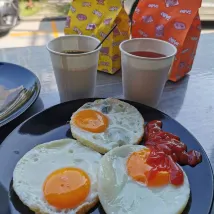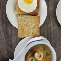 La chambre qui était réservée Comprend également le petit-déjeuner. C'est du porridge aux crevettes ou du porridge au porc. Vous pouvez en choisir un. Il y a du pain grillé, du beurre, de la confiture, des œufs au plat, du thé, du café, qui est un buffet en libre-service.