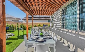 - Outdoor patio with a BBQ grill, dining area, and comfortable lounge seating