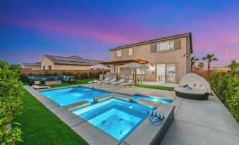 Welcome to Coachella Fun Paradise. This stylish yet comfortable home has something for everyone. From a large glow in the dark gameroom, multiple TVs throughout home, w/ plenty of seating & lounging for large groups & families, w/ many games outdoors & indoors, plus putting green & green open space. The home & all is new, for your enjoyment there is a sparkling pool +spa with relaxing waterfalls. Gather at night around a large conversation set around firepit to enjoy s’mores or night stars.