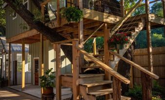 This treehouse is filled with all modern amenities - enjoy the full bathtub, kitchenette & ultra comfortable queen bed! The River Haven Treehouse features stairs that are necessary to access the home. Additionally, the outside yard and grounds of the property are shared with another vacation home, which can be rented together with this property. It's worth noting that the owners also reside on-site.