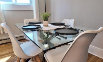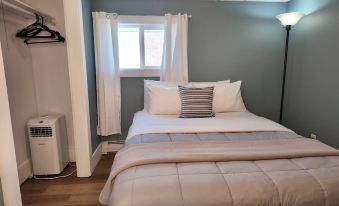 This space has been designed with modern minimalist style, tones of white, black and blue throughout with hints of greenery. The approx. 1000 sqft space consists of two queen bedrooms all with large closets, one full bathroom, a large full kitchen, a dining room seating 4, and cozy living room. See further details on the space below!