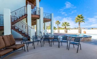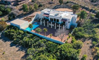 Our fully-equipped kitchen and grill can handle the most bountiful spreads, and we have indoor and outdoor dining areas. There is ample seating for all to lounge and re-energize. All will enjoy the beautiful Arizona night sky in the private spa and pool—especially after lighting a fire in our outdoor kive fireplace.