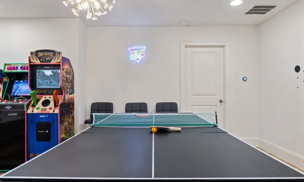 The game room is packed with fun, featuring 4 classic arcade machines, Fuzz Ball, a convertible table that transforms into a pool table, air hockey, and table tennis. You'll also find a selection of board games, plus a yoga mat and dumbbells for a quick workout or some relaxation.