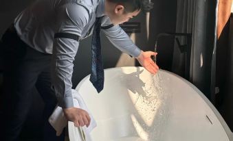 We are a treasure hotel hidden in a coffee shop. The hotel is located near Dongcheng Wanda, close to Dongguan Memory and Dongguan International Trade Center, and is about 9 minutes' walk from Dongcheng Metro Station.Each room is equipped with a 100-inch giant screen projection📽️, equipped with Tencent movie membership, audio-visual experience MAX.🛁Customer Service Equipment🛋️💓Each room is also equipped with an intelligent voice guest control system and high-quality latex mattresses and latex pillows, down pillows, and the bathroom is separated into dry and wet areas with branded shower equipment🚿equipped with an intelligent heated toilet🚽, and the wardrobes are equipped with bathrobes, hollow Dyson-style hair dryers, and instant hot water heaters. Each room is equipped with a Xiaodu smart speaker (which can listen to songs and control all functions of the room), etc.