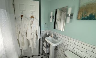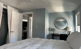 Inside, you’ll find a neat and well-equipped kitchen stocked with dishes, silverware, and a Keurig coffee maker. The bathroom includes fresh towels and cozy robes, while the living room features a 56" LCD TV with a Roku stick so you can easily stream your favorite shows.