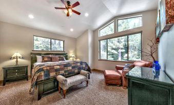 The upstairs master bedroom is a retreat of its own, with a warm king bed, leather lounge chair, & picture windows to the ceiling. The master bathroom is fit for royalty--wake up with a refreshing shower in the glass enclosed walk-in, or unwind at dusk in the jetted tub after a day exploring Tahoe. There are two sinks and plenty of natural light.