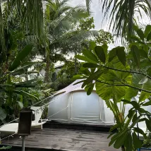 We enjoyed the experience overall. We could hear the waves from our tent when falling asleep and the beach is gorgeous. Air conditioning worked well in the tent. The gym is fantastic and there is also a pool with bar area available for the glamping guests. Having a shared bathroom was not as annoying as we expected, as only 3 tents share bathroom, but some showers never seemed to have hot water. Also the bathrooms could be upgraded as some seemed unfinished (ceiling / walls / locks). It would be nice to have clean mugs and coffee / tea refills available everyday.