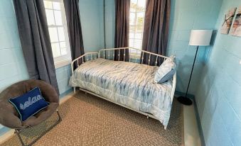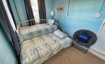 The main TV/Game room space has a custom built retro arcade with over 5,000 retro games as well as Roku HDTV, couch, and recliner chair. There is a commercial sink and refrigerator where you can work with your fish and crab catches! There are two small bedrooms, one with a twin and twin trundle, the other with a full and twin bunk which also has a desk and chair for any virtual school/work! There is a full bathroom with shower & bath tub as well. Out back is a covered patio with fans and outdoor furniture and a hot tub!