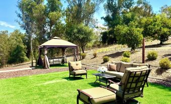 With friends and family lounge by your own private resort with an oversized salt-water pool eight-feet deep, with a water feature fountain creating a roman spa, a spectacular forty-foot pool slide, a welcoming large jacuzzi spa, BBQ station, and multiple seating and lounging areas for relaxing. You never need to leave this property! Private trails throughout the four acres made from the footprint of where one wants to meander, from vineyards and mature Valencia orange orchards (whilst in bloom perfume the whole property) The walking trails are nearly half a mile boasting 30 Pepper trees, 27 Oak trees, 63 Cypress trees, 52 Eucalyptus trees, 13 Orange trees, 5 Olive trees and a several Peach, Lemon, Apple and cherry trees amongst which you will find plenty of resting stops (16) as you leave one area to experience another, finally stopping at the gazebo where you can relax wine in hand while watching a game of badminton, or join in a game of corn hole, push someone on a professional grade swing, Seats, benches, hammocks, tables, chairs, and bench swings have been strategically placed for taking in the views, enjoying the biophilia, and being at one with nature.