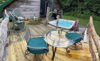 With a rustic look on the exterior while the interior is very luxurious top of the line appliances, washer and dryer, spacious kitchen open to the living area for entertaining. A second-floor Deck with an outdoor jacuzzi The cabin has two bedrooms The lower level has two beds and the second floor bedroom has one bed and one pull out bed in the sectional sofa. The downstairs also has two lounging chairs in front of a wood stove and a covered front porch with couch and chairs.