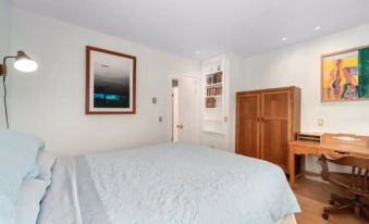 Comfortable with luggage rack and an armoire for settling in. A small bluetooth radio and a few books to read. A work nook with desk and chair complete with surge protector.