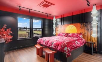 Upper Bedroom 1 (China): Get inspired by the beautiful rich colors and decor referencing ancient Chinese culture, 1 king bed, 50” smart TV, private full bathroom, private walk in closet