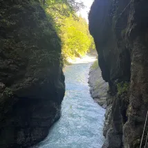 Incredible and unique setting, which unfolds upon arrival as you take the cable car from the valley below, above the Aqua-blue alpine river, across the treetops and then finally you see the hotel nestled in the trees at the edge of an alpine meadow plateau. It’s a unique location, being a modern hotel amongst classic alpine barns and farmhouses, with the soothing background sound of cowbells chiming in from the hills. Our room had a massive terrace with views to the big peaks to the south, and a massive walk in shower we which found every excuse to use! The rooftop infinity pool at the level of the treetops was like nothing I’ve experienced before. Hotel staff were all incredibly warm and helpful, both at the restaurant which serves up fantastic food, and at reception, where they helped me pick out a hiking route up to Kreujberg, and booked me a taxi back to the train station upon departure. If you want a hotel where every room including your bedroom feels like a spa, fresh mountain air, seclusion and panoramic views then this is a go to hotel. In mid October the colours of the forest were amazing too.