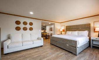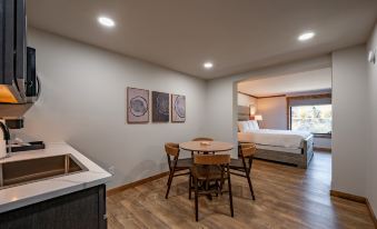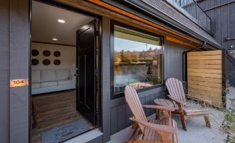 Comfort and convenience from every angle, this poolside suite retreat provides you access to everything in just a few short steps. Spread out in the plush King bed and rest up for your next lake adventure. This suite also has a Queen sleeper sofa for additional sleeping space. Equipped with a full kitchen to cook meals, Smart TV, and a luxurious bathroom with walk-in shower and quality bath products. Walk right out to your private patio for two and take in the fresh mountain air before heading down to the pool or any of our amenities. This suite is accessed from the interior of the first floor for your convenience.