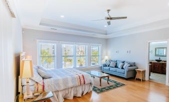 There are 5 bedrooms total, each floor having a master bedroom. The living room and the sunroom both have sleeper sofa's and there's also a sleeper sofa in the 1st floor master for those guests that may want to keep their small children nearby.
