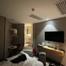 J'ai réservé une chambre avec une offre spéciale. Lorsque je l'ai réservé, je me suis souvenu que la page disait qu'il y avait une fenêtre (petite). Mais quand je suis arrivé, j'ai constaté qu'il n'y avait pas de fenêtre. Il est très proche de la station de métro Quzhuang, à environ cinq minutes à pied, et l'attitude du service est également très bonne. La chambre est juste moyenne, il y a une marche à l'entrée haha. Il n'y a pas de porte entre la salle de douche et le lit, seulement un rideau. L'insonorisation est correcte.